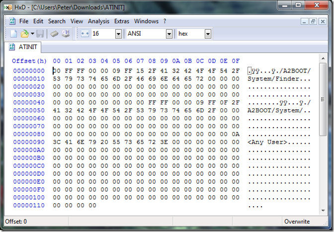 An additional file needed during netbooting is the user’s ATINIT file. This informs GS/OS what startup program to launch. I’ve provided an example ATINIT file that simply launches the GS/OS Finder application located in the System folder of the A2BOOT volume. You can edit this file using a binary file utility and change the startup application and the startup prefix. Note the string length value on the byte preceding the actual strings. The Apple IIgs Technical Note #77 describes the ATINIT file format.