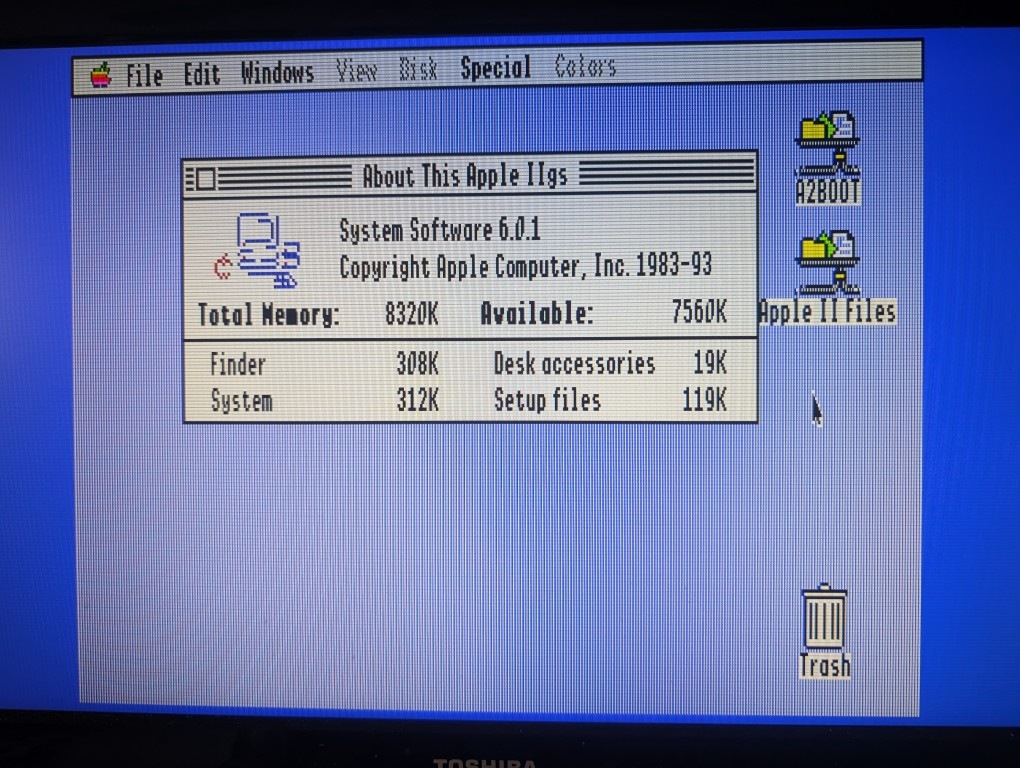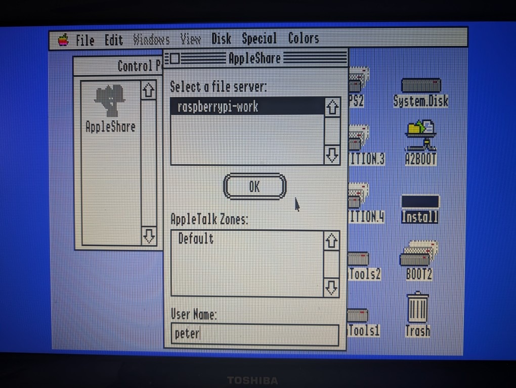 Prior to that, I have been able to netboot an Apple IIgs from a classic Mac running AppleShare (2.x or 3.x) with its Apple II networking support. This was all through LocalTalk network cables. The setup process involved enabling the Apple II support on the server, booting an Apple IIgs from 3.5” diskette with AppleTalk drivers, and then installing Apple IIgs files over the network to the server. Once the setup is completed, the Apple IIgs would not need a disk drive anymore and can directly boot from the server.